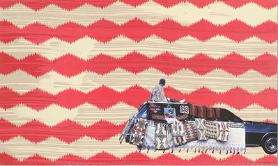 A notable strength of the exhibition is its focus on women artists of color who have been underrepresented in the museum’s permanent collections and in its exhibition program. Artists like Mickalene Thomas challenge historical narratives by creating compositions that echo those of nineteenth-century European painters but through wholly novel techniques and media, combining woodblock, screen-printing, and digital photography. Wendy Red Star, an indigenous American artist of the Crow Nation, creates colorful, often playful prints that nonetheless convey the struggles of indigenous marginalization and the legacy of European colonization on the continent by combining appropriated indigenous motifs with images of everyday life on the reservation. Ethiopian-born Julie Mehretu creates large-scale abstract compositions that speak to the traditions of European and American abstraction while compounding these histories with contemporary global concerns regarding climate change and migration.