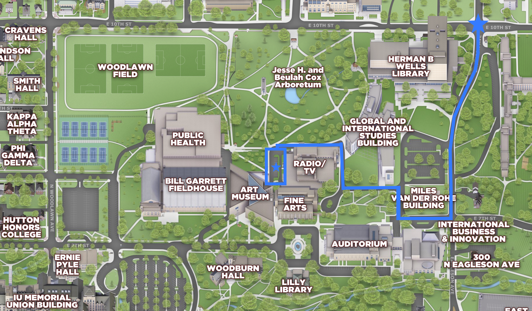 To get to the accessible parking lot, turn west from Eagleson Avenue onto Seventh Street. You’ll pass the Eskenazi School of Art, Architecture + Design Mies van der Rohe Building on the right. Turn right, then immediately left to pass the Global & International Studies Building. You'll follow this street behind the Radio and TV building to reach the parking lot. Download a map showing the route from Wells Library (corner of 10th Street and North Eagleson Ave) to the parking lot.